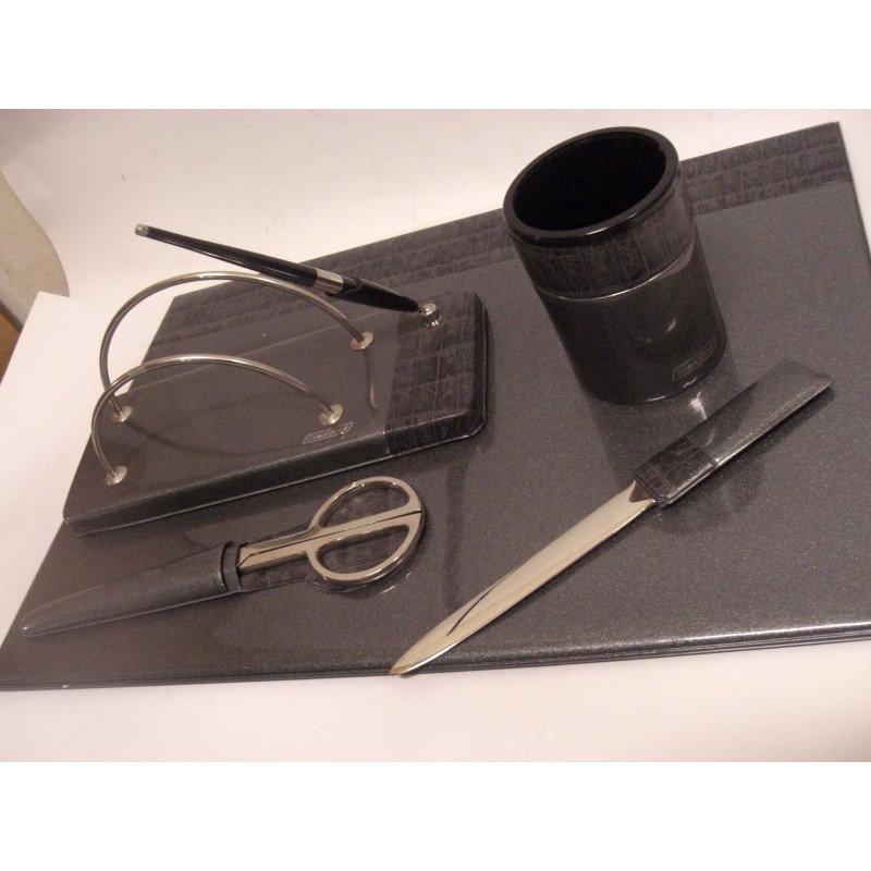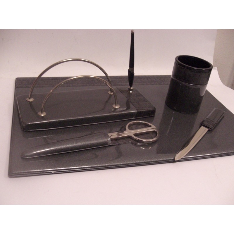 Scrittoio in similpelle grigio argentato ,completo per scivania, accessori come da foto, materiale plastica lucida moderna.